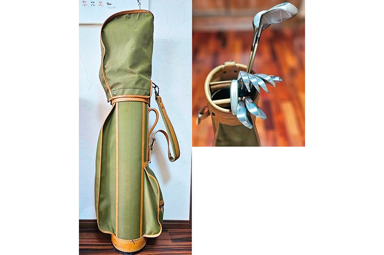 頂いたバッグとギアは写真のようにやや古めかしいものでした。形状は同じようですが、ドライバーとフェアウェーウッドは今のものとは全く違っていて、パーシモンとも違っています。